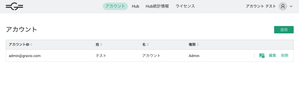 作成したGravioアカウントは上段メニューの「アカウント」を選択することで登録されているアカウントが一覧で表示されます。