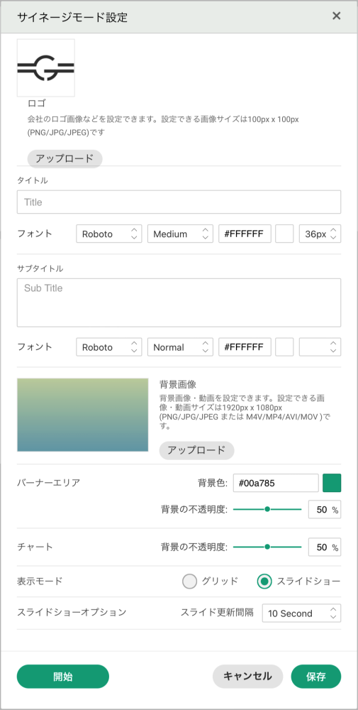 設定パネルではサイネージ画面をデザインする項目を選択して開始ボタンを押すとサイネージモードに切り替わります。
