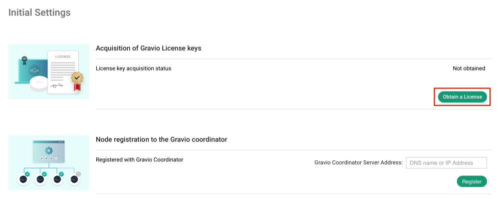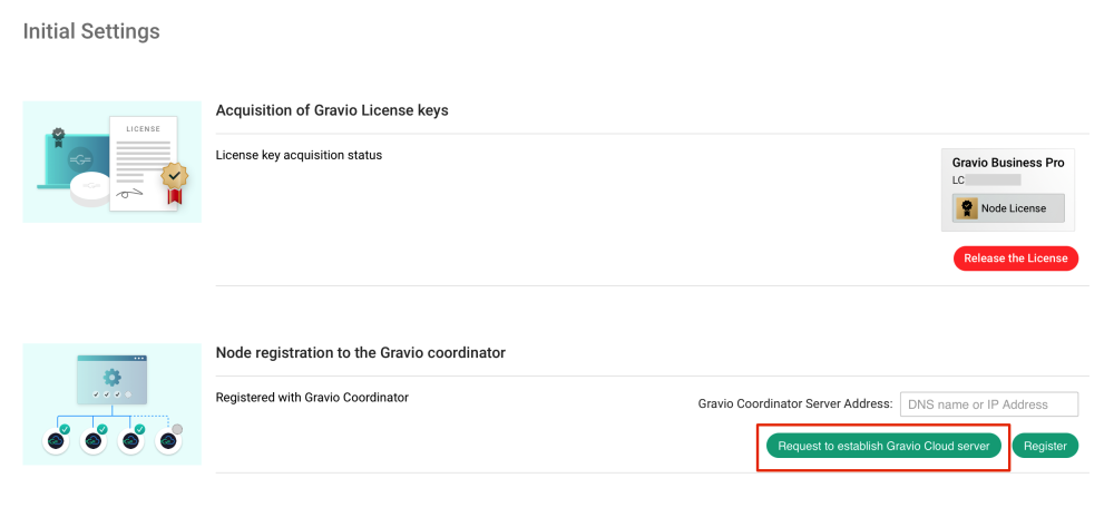 Once you get the license, reload your browser. You will subsequently see a button to request the installation of a Gravio Cloud server under the section “Node Registration to the Gravio Coordinator”. If you have a Gravio Coordinator, you can register your nodes with your Gravio Coordinator in this section by entering the IP address of the Coordinator. However, if you don’t have a Gravio Coordinator yet, you can request one to be set up by pressing the button “Request to establish a Gravio Cloud Server”. This will create a Gravio Coordinator and main instance on our cloud infrastructure.