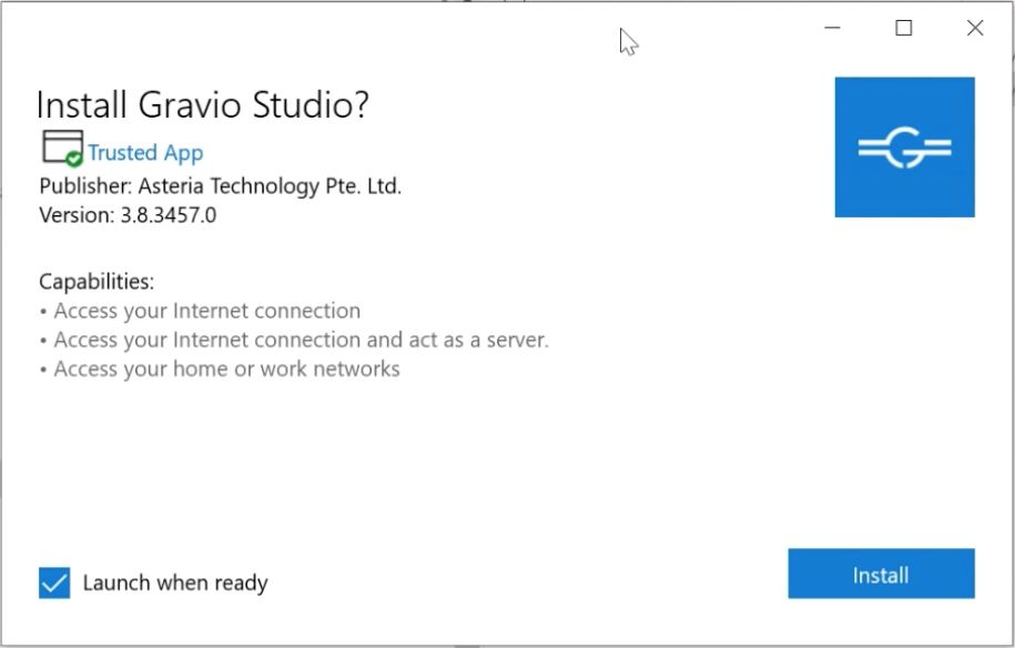 The following confirmation window will open. Click on the “Install” button and follow the steps install Gravio Studio: