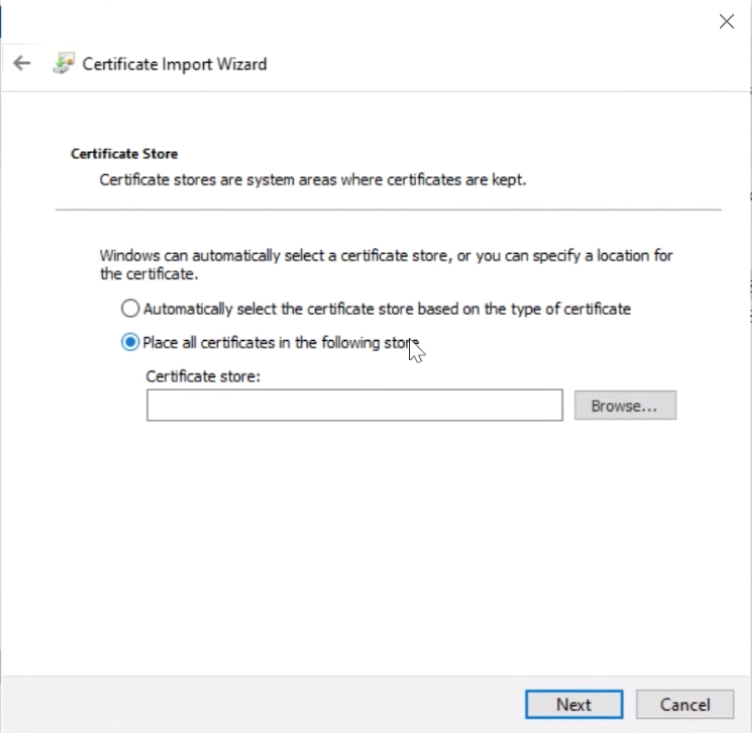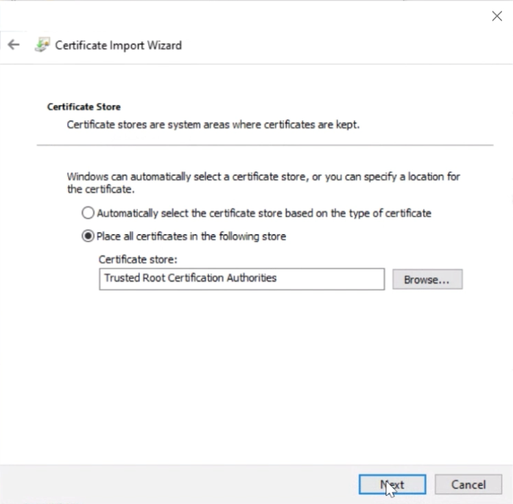 After clicking “Next” you will see a confirmation screen, click “Yes” to confirm that you want to go ahead with the installation, then you will see the Certificate Import Wizard. Here please select to manually choose the store: