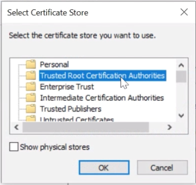 And click on the “Browse” button. In the popup that opens, please select the “Trusted Root Certification Authorities” option: