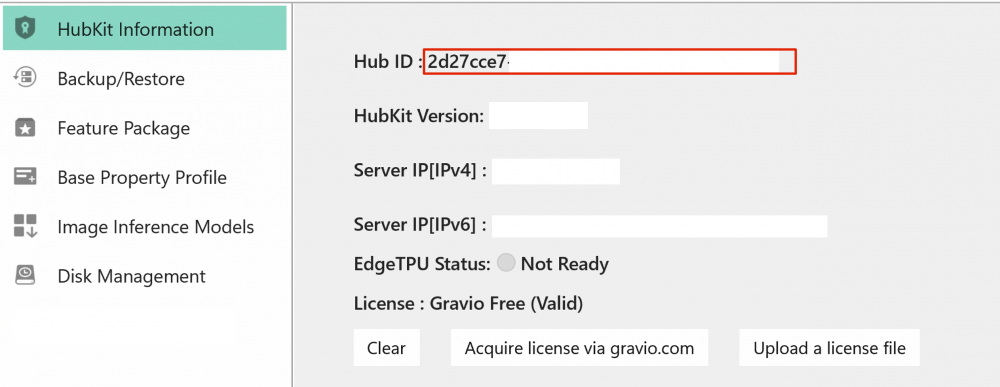 The Hub ID is displayed in the HubKit Information on the Settings panel when you open the Hub from Gravio Studio, so please copy and register it.