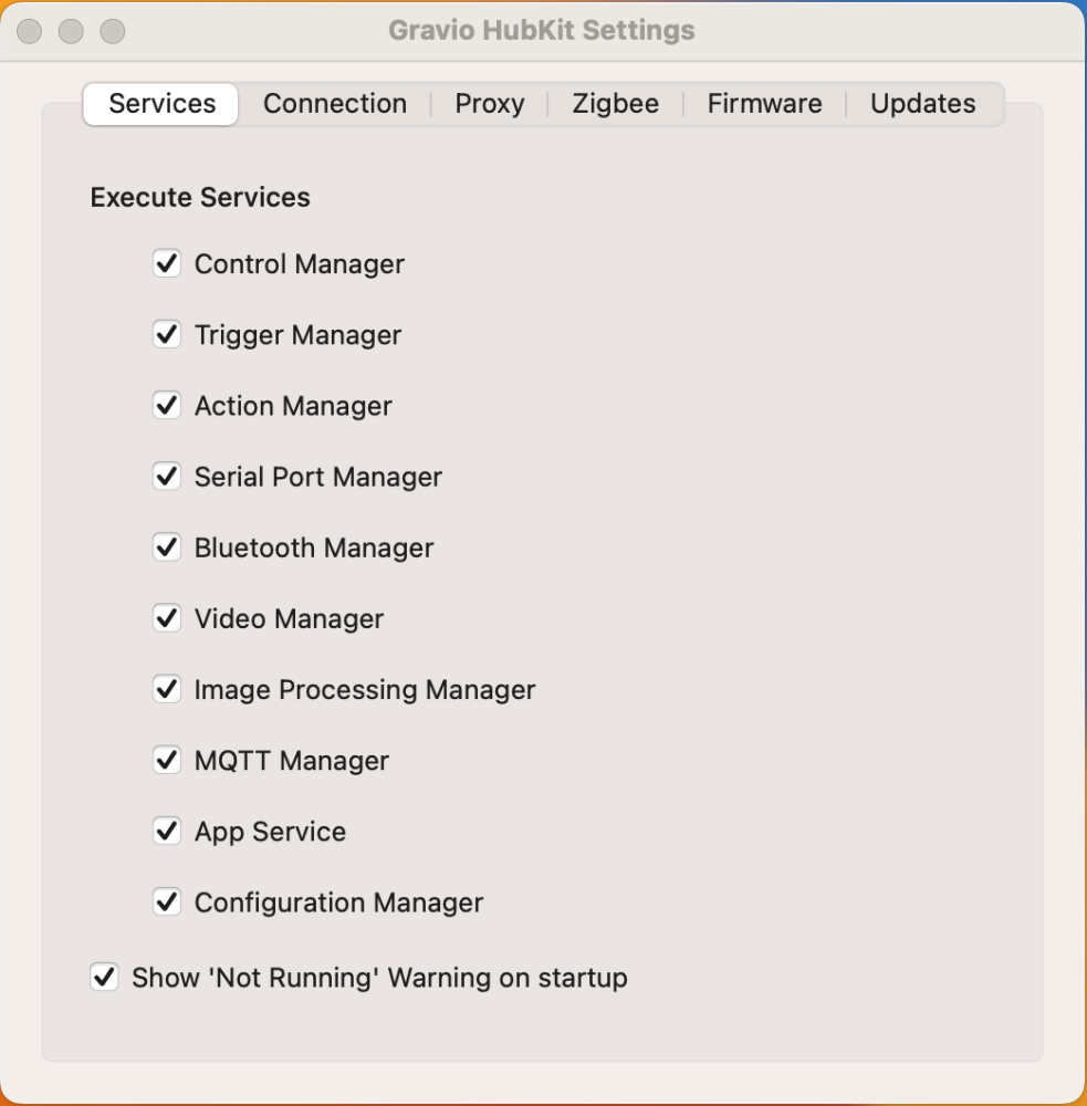 Use this when you need to start or stop the services that make up the HubKit individually. If you want to display a warning when a service is stopped at the time of launching HubKit, select ‘Show Service Stop Warning at Startup’.