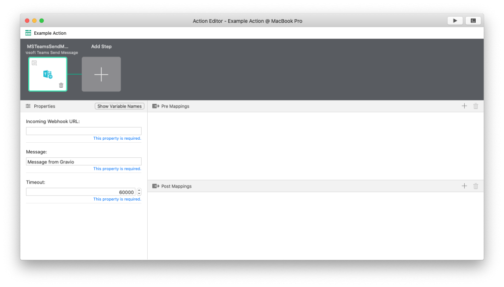 The MSTeamsPostMessage action component can use the Microsoft Teams API to post a message to the channel specified in the component’s properties.