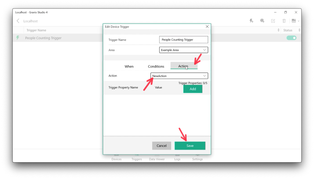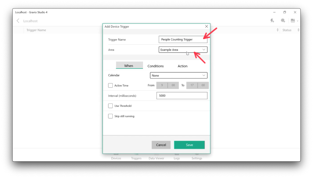 Now let’s add a trigger to the software sensor. Pick the trigger tab and create a new trigger. Give it a sensible name and pick the right Area that contains the software sensor layer: