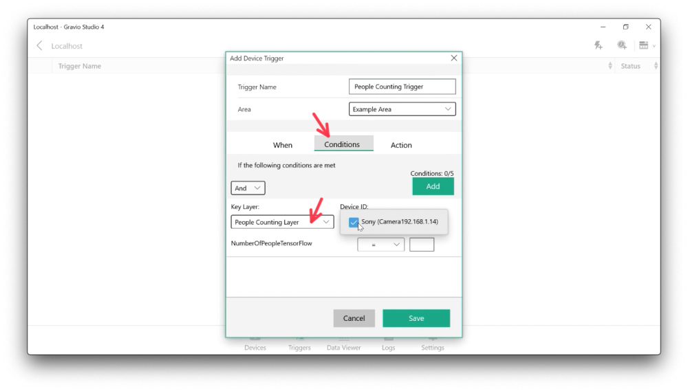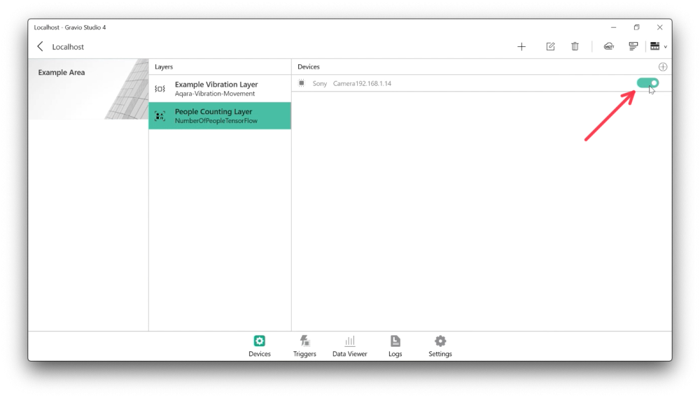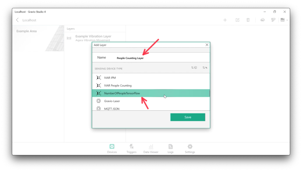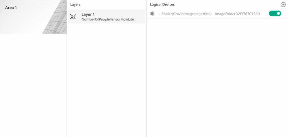 Now that you have installed and connected the camera and deployed the AI model, you have a new layer available that you can add in the Area section of the Gravio Devices tab. Just add the layer as you would any layer and pick the layer named after the AI model. This will then behave like any other hardware sensor.
