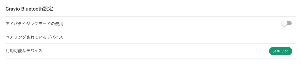 最初にBluetoothデバイスとのペアリングを行うためにデバイスをペアリングモードにして「スキャン」ボタンを押します。