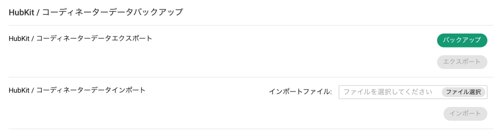 HubKit / コーディネーターのデータをバックアップするにはバックアップボタンを押します。しばらくするとバックアップが完了しますのでエクスポートボタンを押すことでバックアップしたファイルをローカルPCにダウンロードできます。