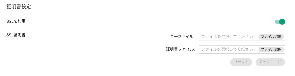 証明書設定でSSLを利用するはオンにしたままでSSL証明書にキーファイルと証明書ファイルをアップロードします。