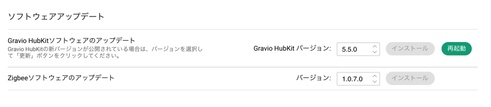 更新するHubKitとコーディネーターのソフトウェアのバージョンを選択してインストールボタンを押します。インストールが完了すると再起動ボタンを押してください。