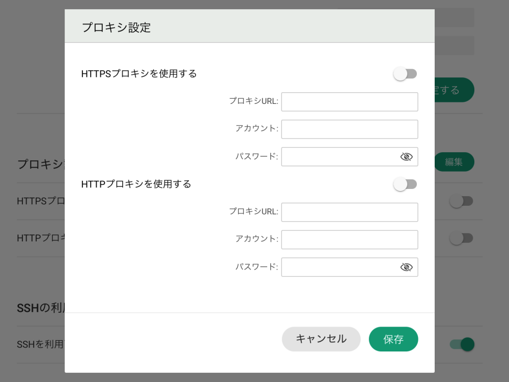 設定ボタンを押すと設定画面が表示されますので、HTTPSとHTTPのプロトコルでそれぞれに使用するProxyサーバーのアカウント情報(プロキシURL、アカウント、パスワード)を入力します。
