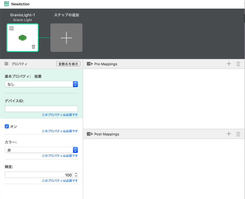 | デバイスID | On/OffするデバイスID, 何も設定されていないときは全てのGravio Lightに対してON/OFFを実行します。Gravio Lightを複数使用する場合は、デバイスIDをカンマ区切りで記述することができます |