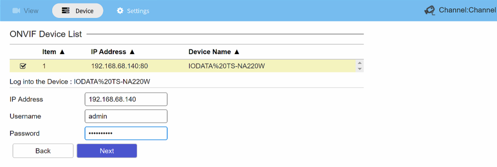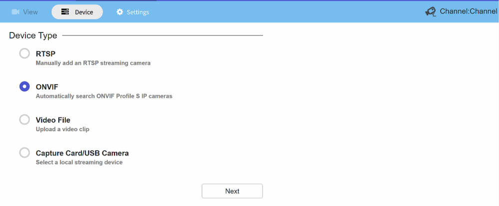 使用するカメラはONVIFカメラですのでONVIFを選択して Next ボタンを押します。