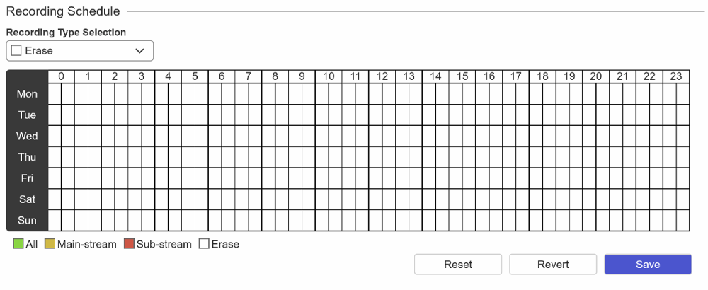 Recording Type Selectionで Erase を選択してからMain-stream(黄色)が録画されているのを範囲を指定して解除(白色)にします。