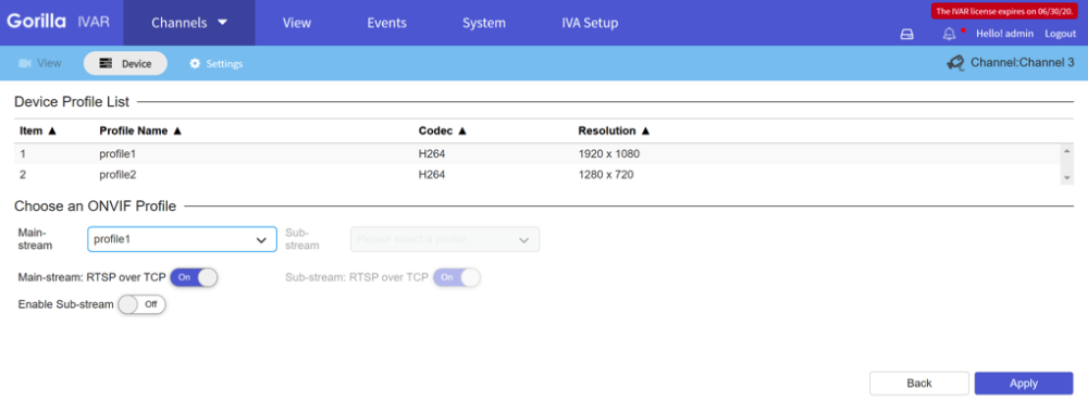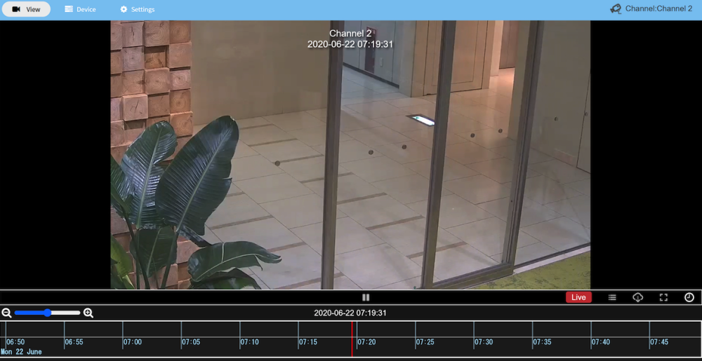 Channels メニューから Channel 2 を開いて View を選択するとライブ映像が表示されます。