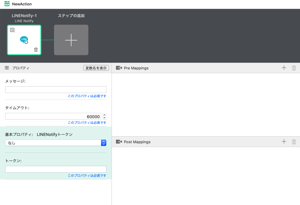 | トークン | LINE Messaging APIで発行したチャネルアクセストークン |