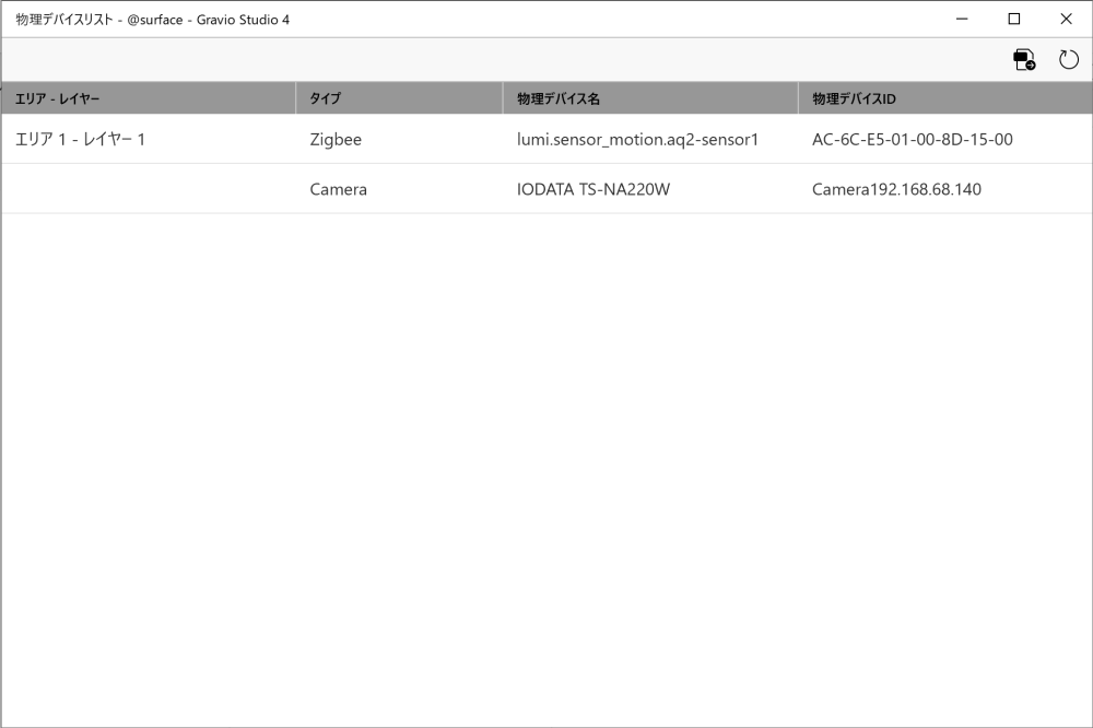 - 物理デバイスがバインドされているエリア・レイヤー(バインドされていない場合は空)と物理デバイスのタイプ、物理デバイス名、物理デバイスIDがリストに表示されます。
