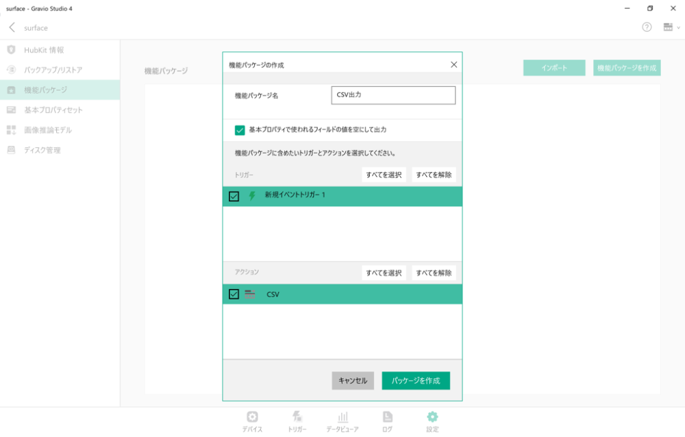 「パッケージ作成」ボタンを押すと機能パッケージが作成されます。