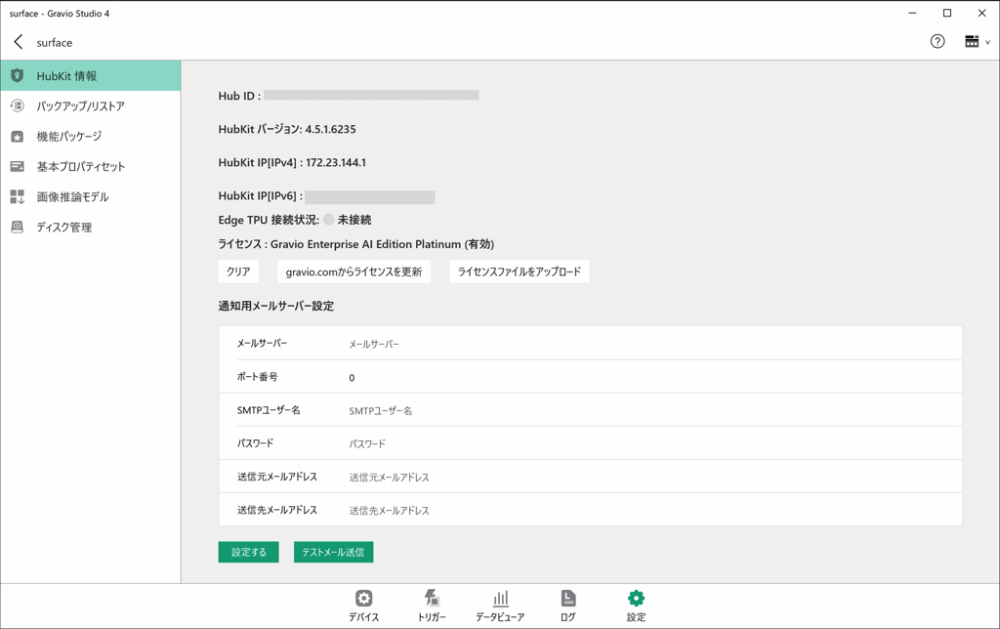 設定を行っているHubのHub ID、HubKitのバージョン番号ならびにIPアドレスの表示、通知用メールサーバの設定を行うことができます。