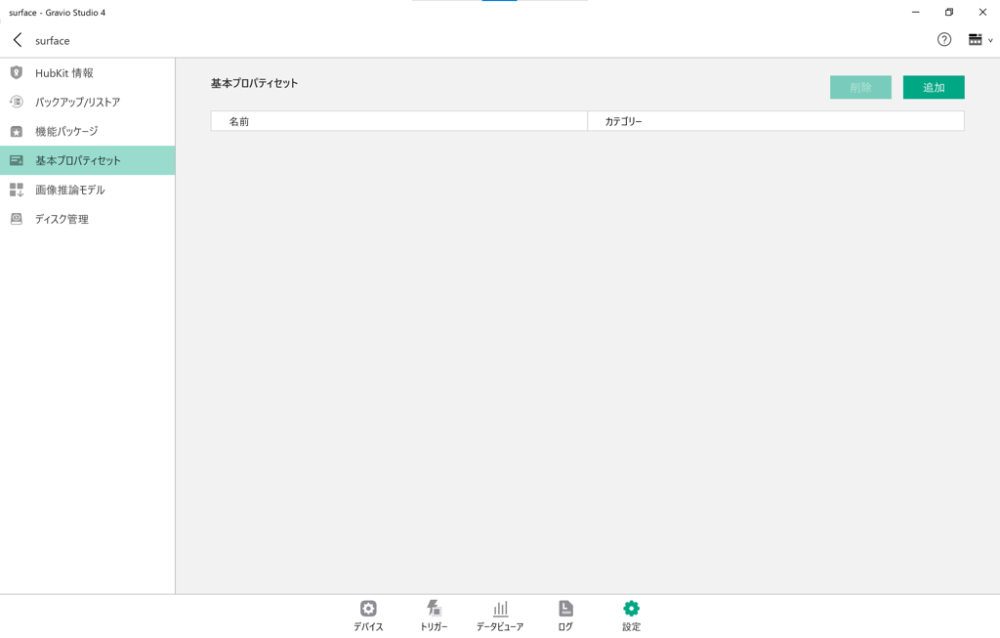 [設定]タブでは、HubKit情報と通知、バックアップ・リストア、基本プロパティ設定、画像推論モデルのダウンロードとディスク管理の機能があります。