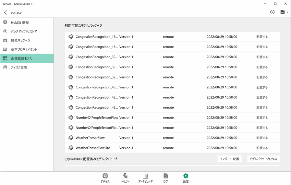 ローカルに保存されているモデルパッケージを登録するにはインポート・配置ボタンを押してファイルを選択してからアップロードしてください。