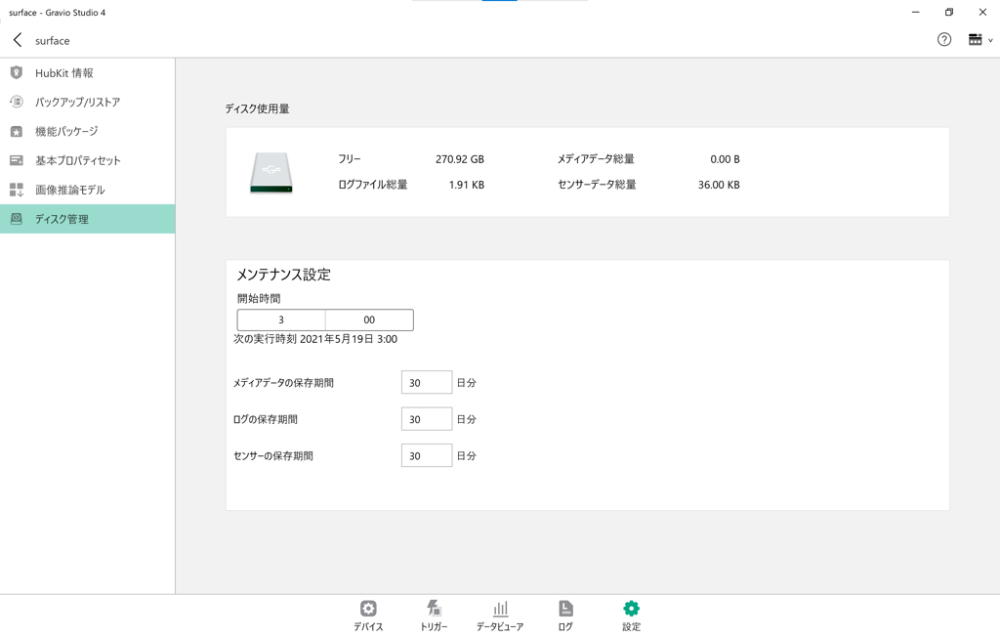 ディスク使用量の表示とメンテナンス設定で、ディスクにメディアならびにログの保存期間と処理実行開始時間の登録をすることができます。