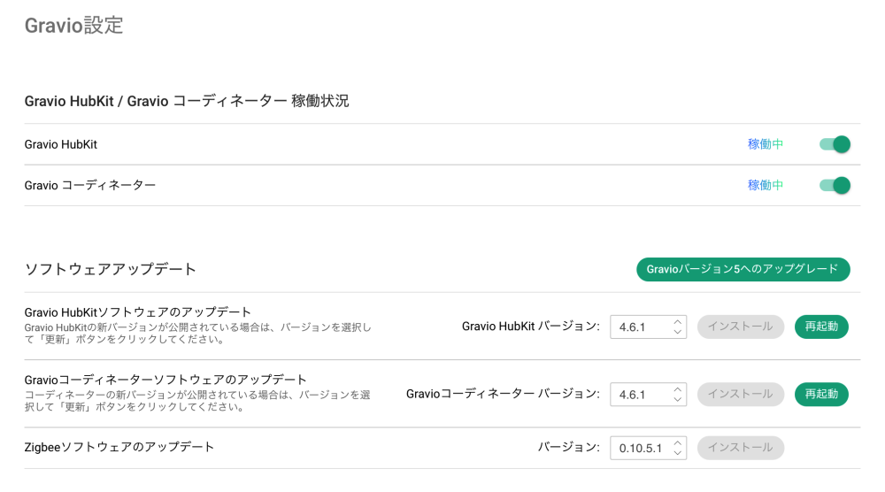 Update Managerが深夜の自動更新で最新版に更新されると、Gravio設定タブに Gravioバージョン 5へのアップグレード ボタンが表示されますので、確認してください。