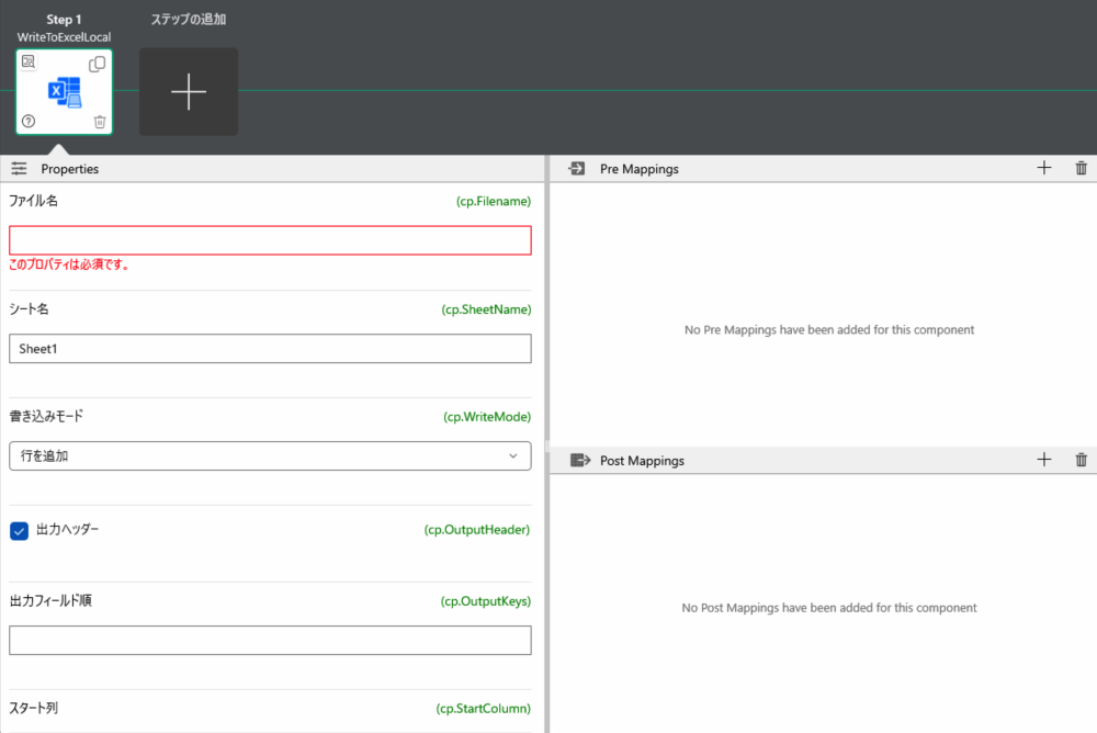 | 書込モード | 新しいファイル(New File)を作成するか、セルを更新(Overwrite)するか、行を追加(Append)するかを指定. cp.WriteModeの値としては、 "New" , "Append" , "Overwrite" のいずれか |