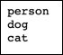 1. クラス情報データは、認識する物体の名称リストです。テキストエディタでファイルを新規作成し、認識する項目を各行に1つずつ記載します。例えば、person, dog, cat の3つを認識する学習モデルを構築する場合、各行にそのラベルを記載します。この記載順で、認識する物体の識別子は、先頭行を0として、通し番号で割り当てられます。(person=0, dog=1, cat=2となります)