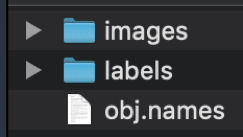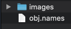 2, クラス情報データのファイル編集を完了し保存します。ファイル名称は任意に決めることができますが、ここでは、imagesフォルダと同じPC上の作業フォルダ配下に、obj.names という名称にします。